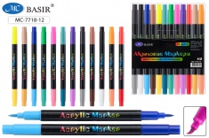 Набор маркеров-акриловые: двухсторонние /два цвета в одном/, с мягкой кистью, на водной основе, толщина линии/мазка 1-5 mm, для любых поверхностей; круглый чёрный корпус, вентилируемый колпачок, в пластиковой упаковке, 12 штук-24 цвета.