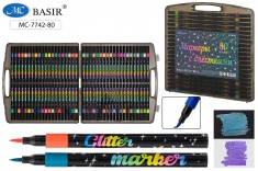 Набор маркеров: с блёстками, с мягкой кистью, на водной основе, толщина линии/мазка 1-5 mm, для любых поверхностей; круглый чёрный корпус с рисунком, вентилируемый колпачок, упаковка-пластмассовый тонированный бокс, 80 цветов.