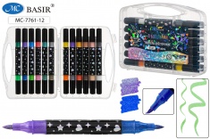 Набор маркеров: двухсторонние /два цвета в одном/ с блёстками, с мягкой кистью, на водной основе, толщина линии/мазка 1-4 mm, для любых поверхностей; круглый чёрный корпус с серебристым рисунком, вентилируемый колпачок, упаковка-пластмассовый бокс, 12 штук-24 цвета.
