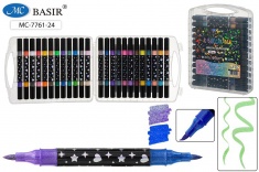Набор маркеров: двухсторонние /два цвета в одном/ с блёстками, с мягкой кистью, на водной основе, толщина линии/мазка 1-4 mm, для любых поверхностей; круглый чёрный корпус с серебристым рисунком, вентилируемый колпачок, упаковка-пластмассовый бокс, 24 штуки-48 цветов.