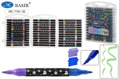 Набор маркеров: двухсторонние /два цвета в одном/ с блёстками, с мягкой кистью, на водной основе, толщина линии/мазка 1-4 mm, для любых поверхностей; круглый чёрный корпус с серебристым рисунком, вентилируемый колпачок, упаковка-пластмассовый бокс, 36 штук-72 цвета.
