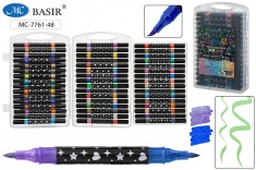 Набор маркеров: двухсторонние /два цвета в одном/ с блёстками, с мягкой кистью, на водной основе, толщина линии/мазка 1-4 mm, для любых поверхностей; круглый чёрный корпус с серебристым рисунком, вентилируемый колпачок, упаковка-пластмассовый бокс, 48 штук-96 цветов.
